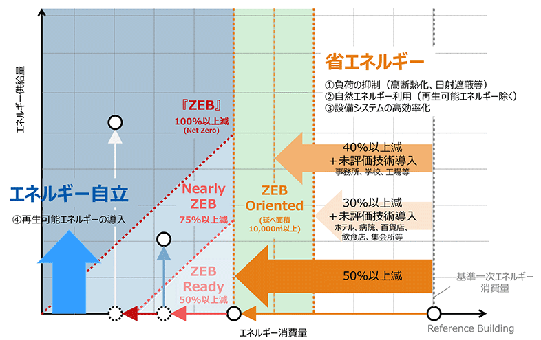 - ZEB:消費エネルギーと創エネルギーバランスが実質ゼロ